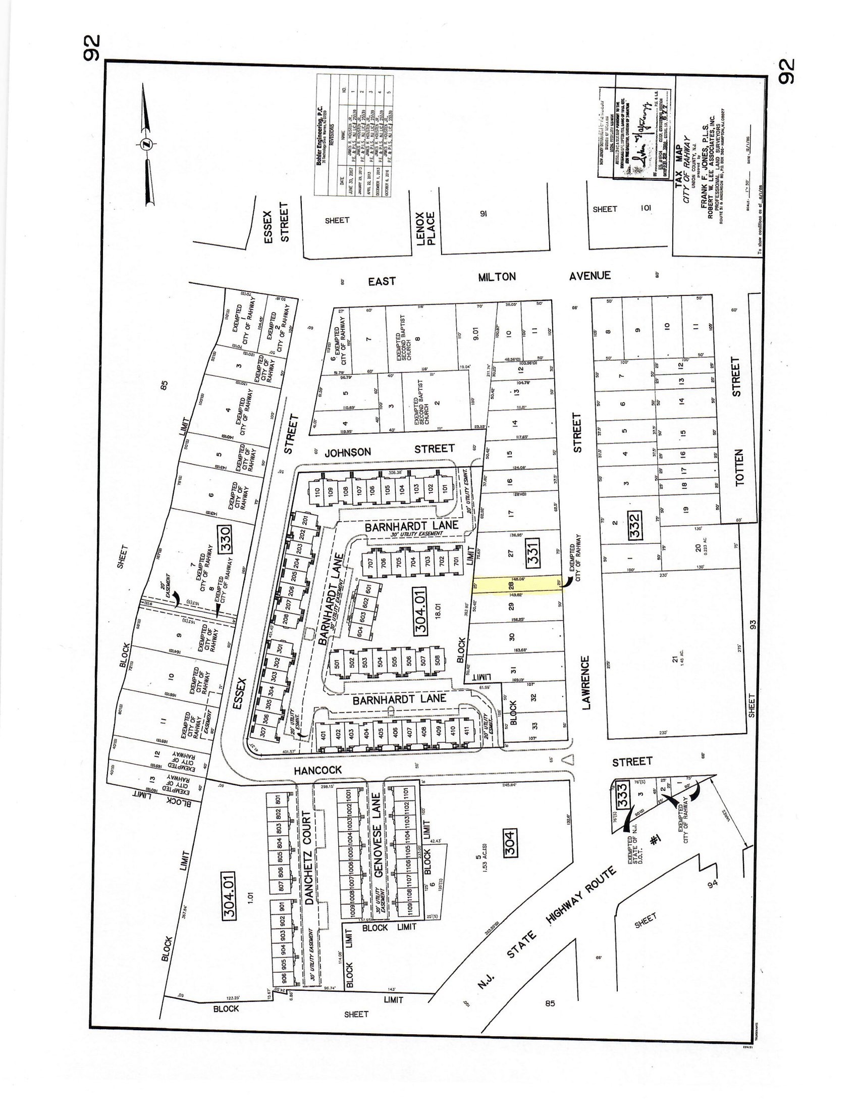 Block 331, Lot 28 is located within the R-2 zone but is less than the minimum size required for development. The vacant lot is a narrow strip measuring 25 x 150 and assessed for $18,700, according to property records, which also indicate that about 36 percent of it is located within a floodplain. The fair market value of the property has been appraised by McNerney & Associates as $18,500, which will be the minimum bid at auction.