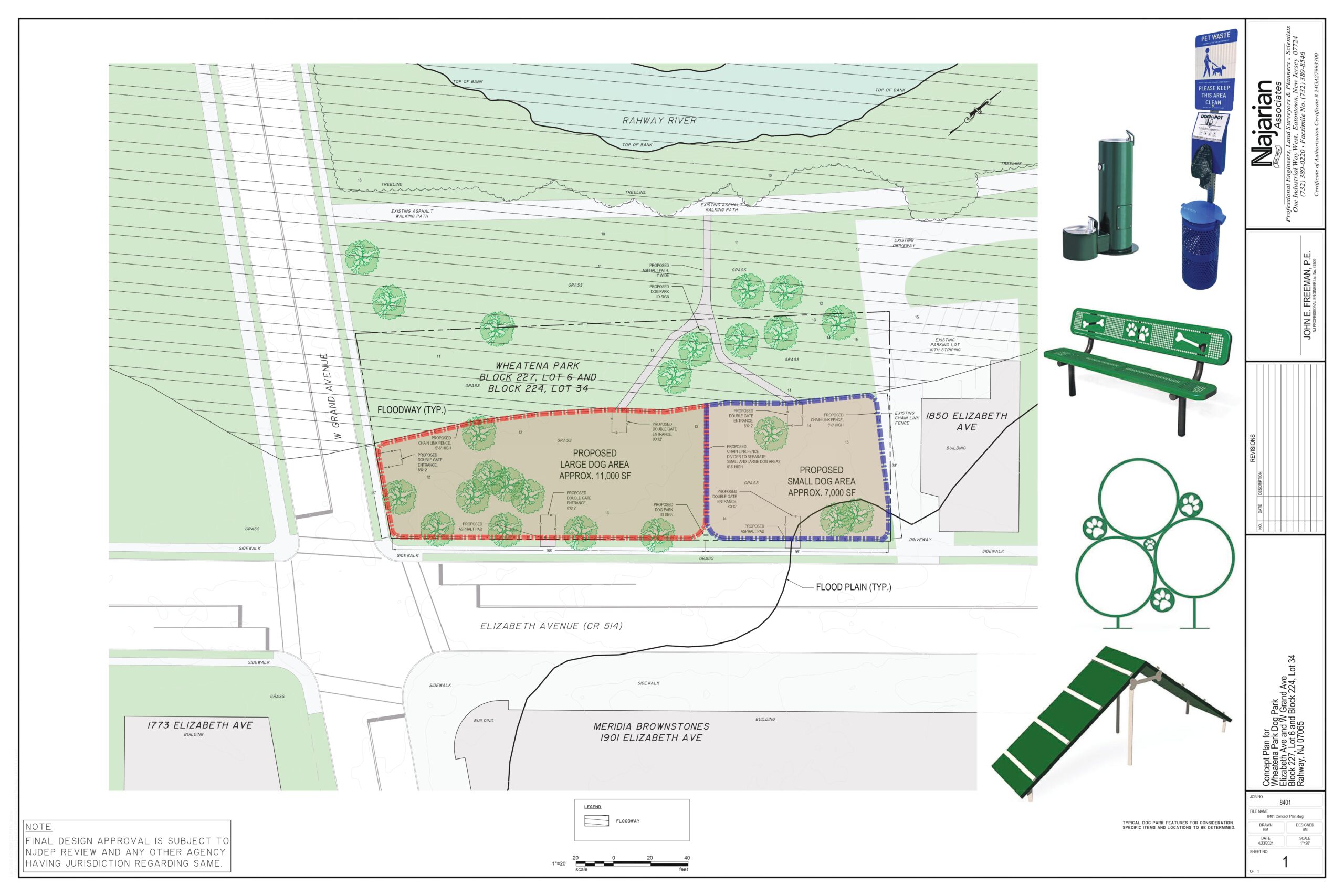 In a brief presentation to City Council, City Engineer Daniel Lee presented a conceptual plan for the dog park. The 18,000-square-foot park (~0.41 acres) would have two separated areas: one for large dogs of about 11,000 square feet (~0.25 acres) up to the corner of West Grand Avenue, and another for small dogs, about 7,000 square feet (~0.16 acres), up to a neighboring commercial property along Elizabeth Avenue.