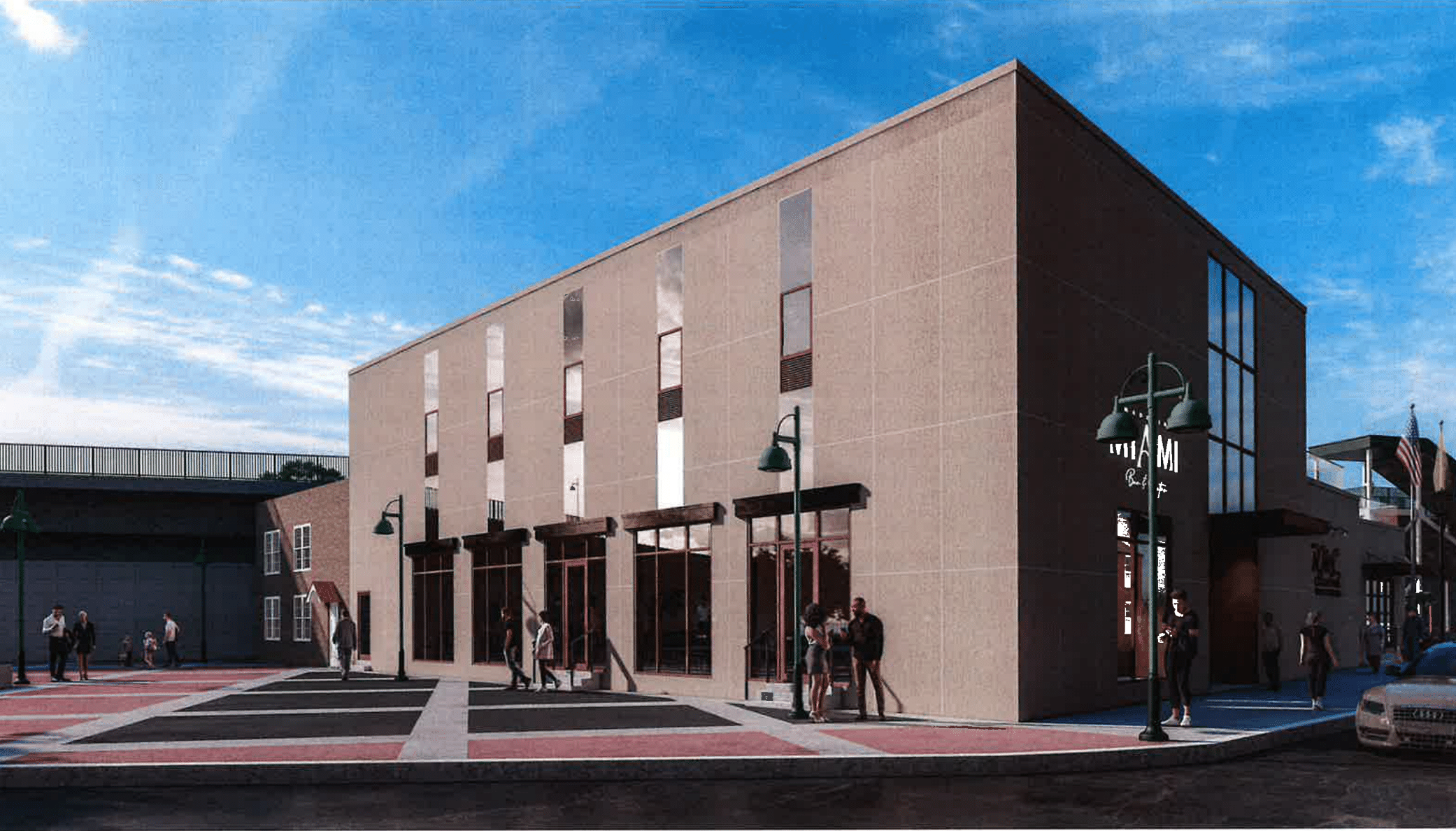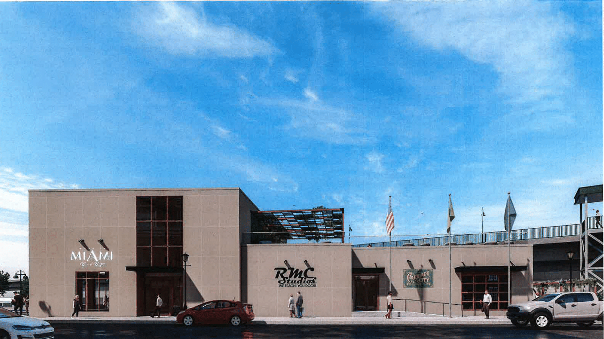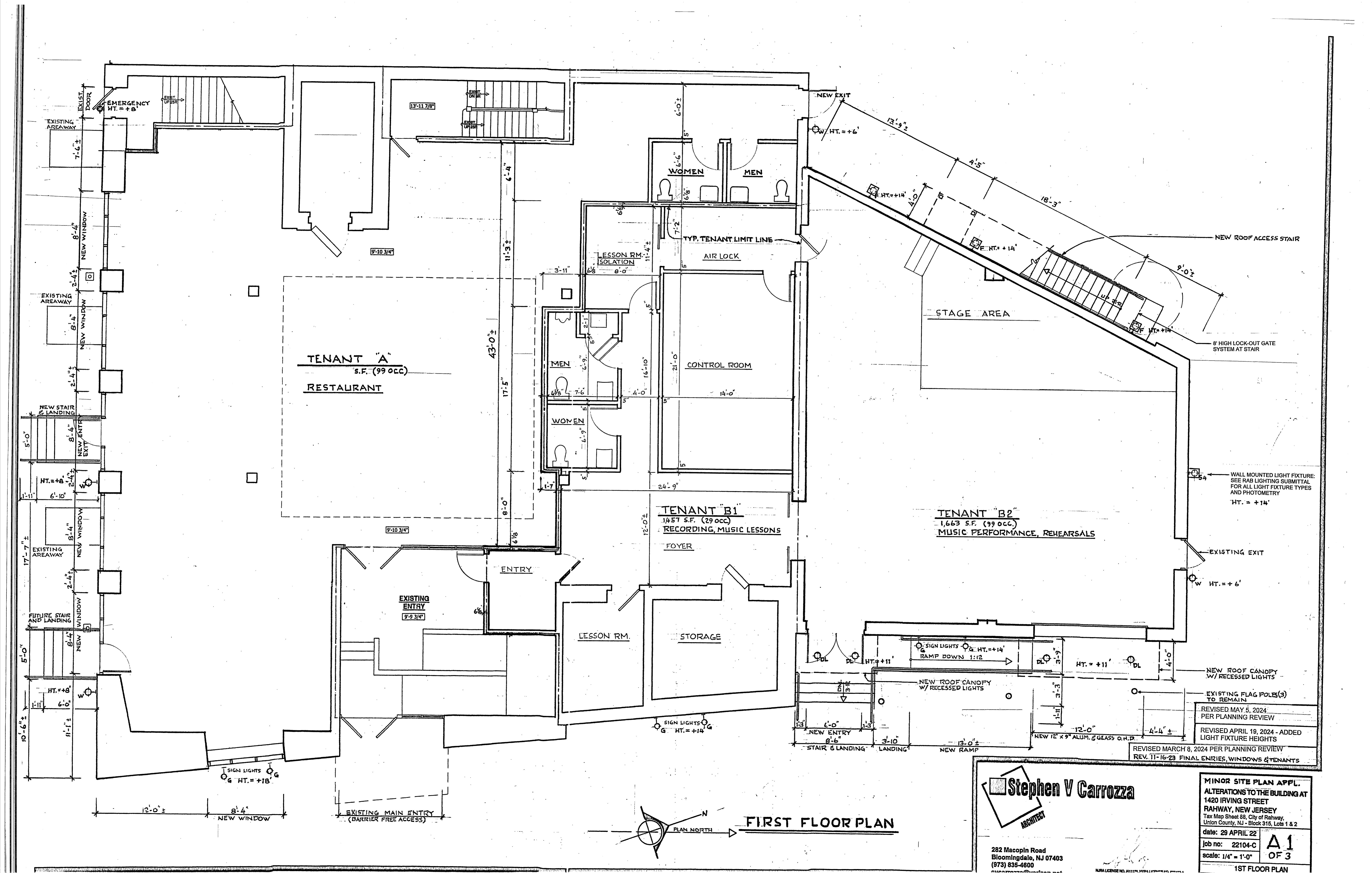 The performance space, B2, would have a barrier-free access ramp and stairs to the main entrance and an exit on the side that already exists along Irving Street. A large opening with a glass and aluminum door could be open to the public for some events. Plans for the exterior elevation of the east and south, facing Train Station Plaza, show three ground-floor tenants would have three separate signs. One will be RMC Studios, a Garwood-based music instruction, and the other two still to be determined. Five groups of large windows would face the plaza on the south side, with two new entryways and landing and stairs.
