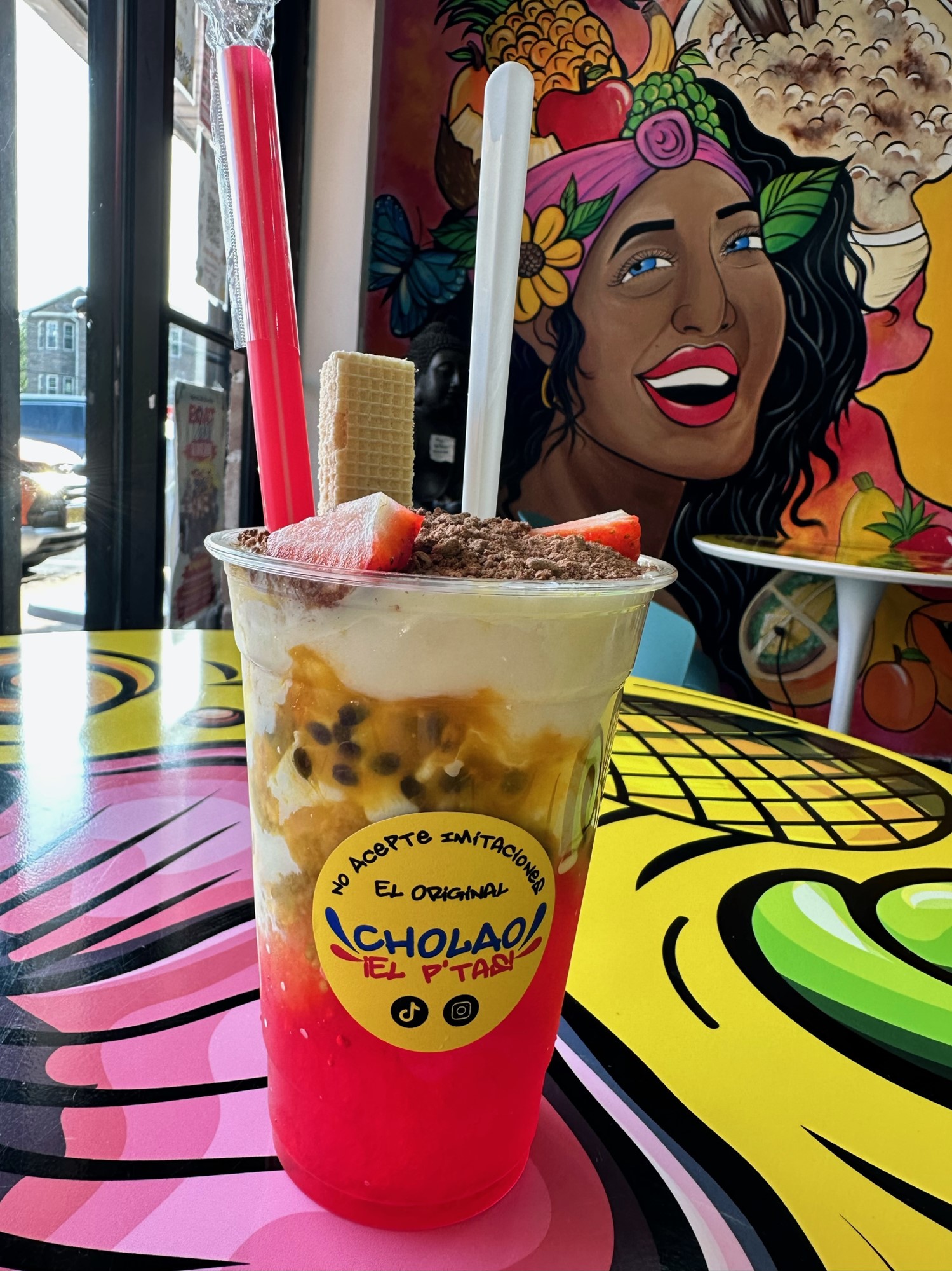 The Colombian shaved ice from Cholao El P’Tas features kola syrup, banana, passion fruit, lulo, pineapple, soursop, blackraspbery sauce, condensed milk, milo, and strawberry. Talk about a mouthful!